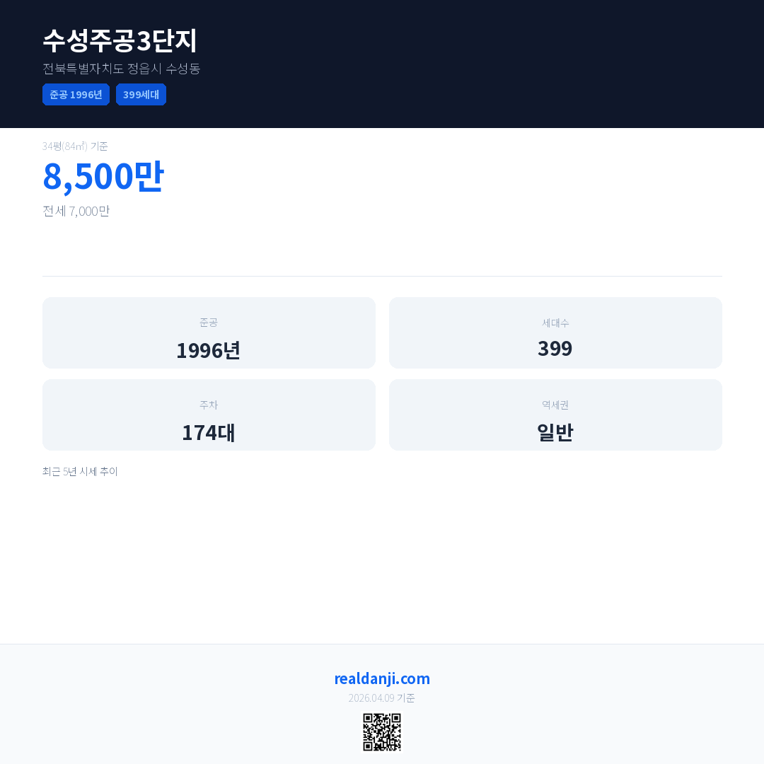 수성주공3단지은(는) 1996년에 준공되었으며, 현재 30년차입니다. 총 399세대 규모입니다.