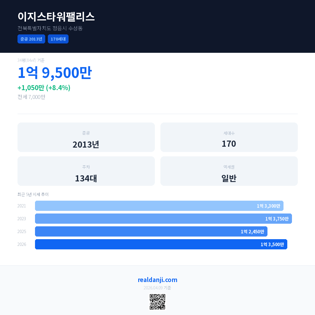 이지스타워팰리스 국민평형 기준 2026년 평균 거래가는 1억 3,500만으로, 전년 대비 8.4% 상승 했습니다.