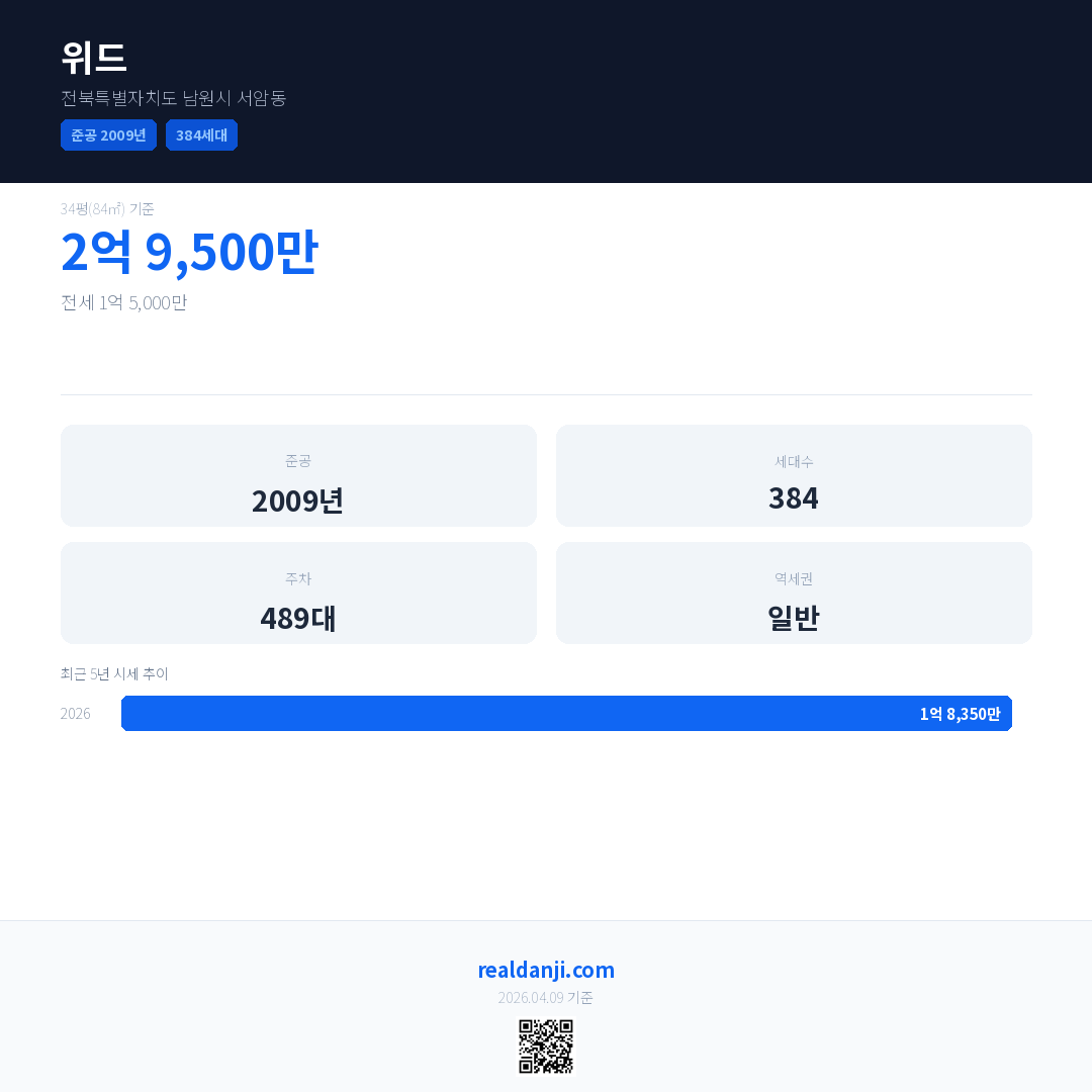 위드은(는) 2009년에 준공되었으며, 현재 17년차입니다. 총 384세대 규모입니다.