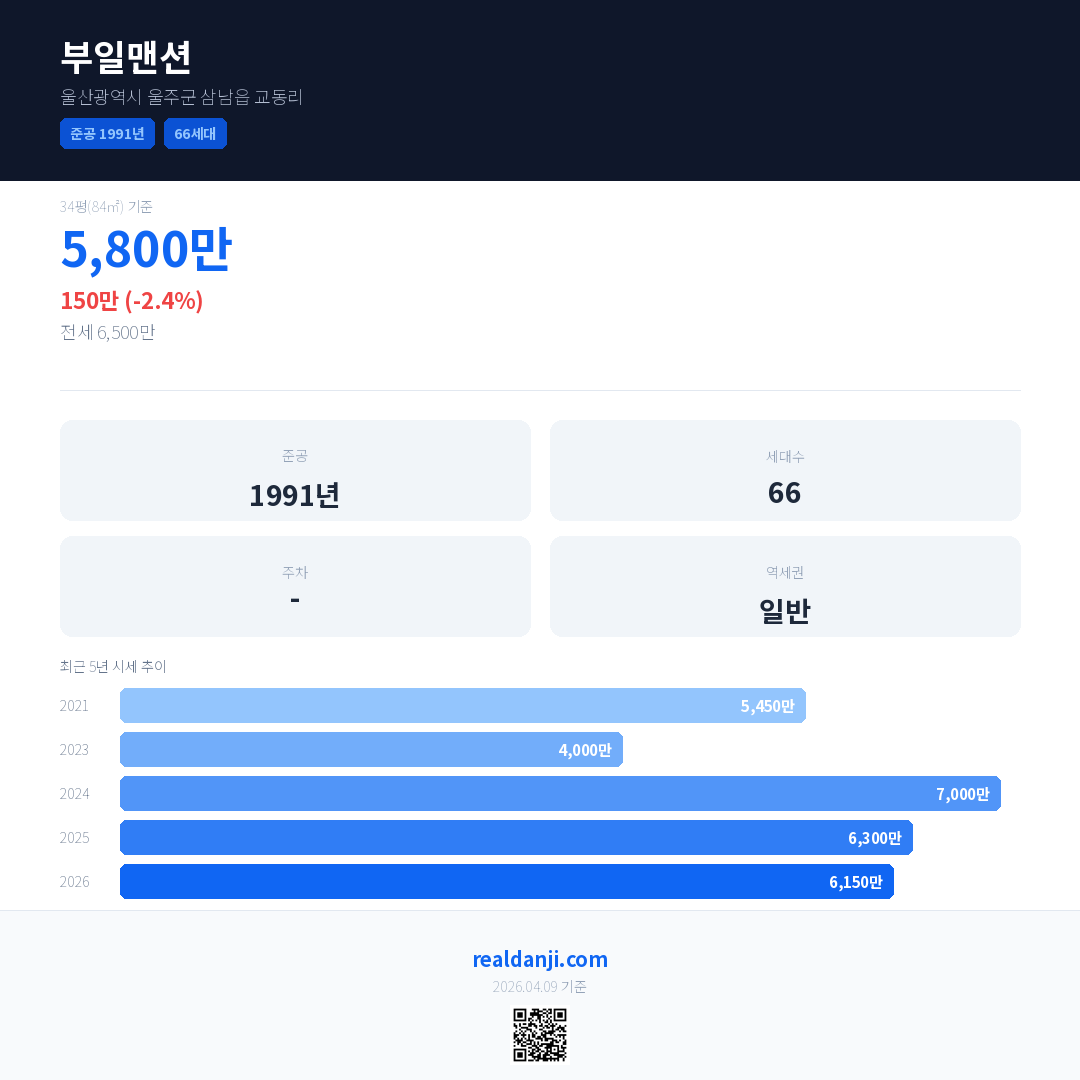 부일맨션 국민평형 기준 2026년 평균 거래가는 6,150만으로, 전년 대비 2.4% 하락 했습니다.