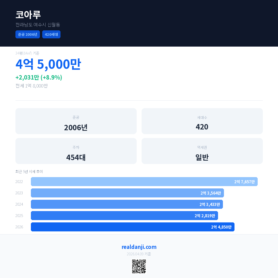 코아루 국민평형 기준 2026년 평균 거래가는 2억 4,850만으로, 전년 대비 8.9% 상승 했습니다.