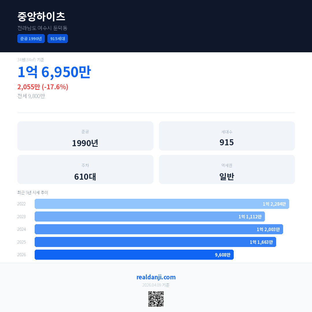 중앙하이츠 국민평형 기준 2026년 평균 거래가는 9,608만으로, 전년 대비 17.6% 하락 했습니다.