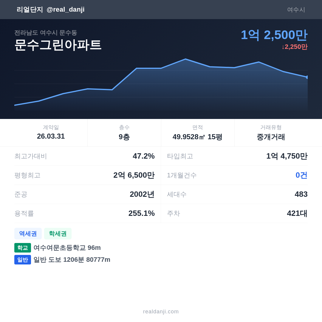 문수그린아파트 최근 거래가는 2억 6,500만입니다. (2026-03)