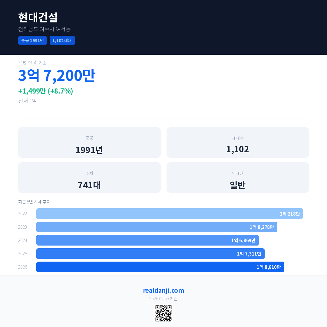 현대건설 국민평형 기준 2026년 평균 거래가는 1억 8,810만으로, 전년 대비 8.7% 상승 했습니다.