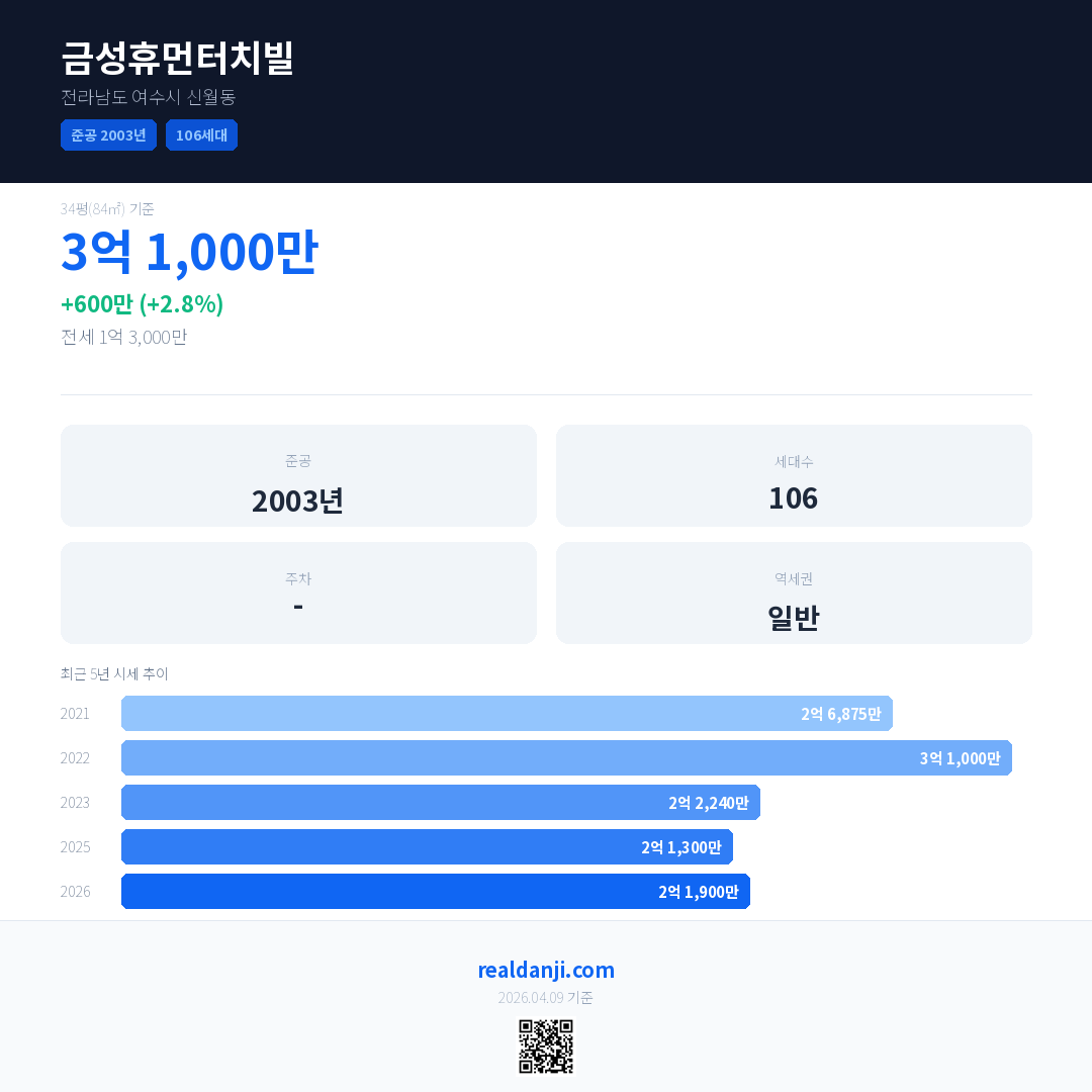 금성휴먼터치빌은(는) 2003년에 준공되었으며, 현재 23년차입니다. 총 106세대 규모입니다.