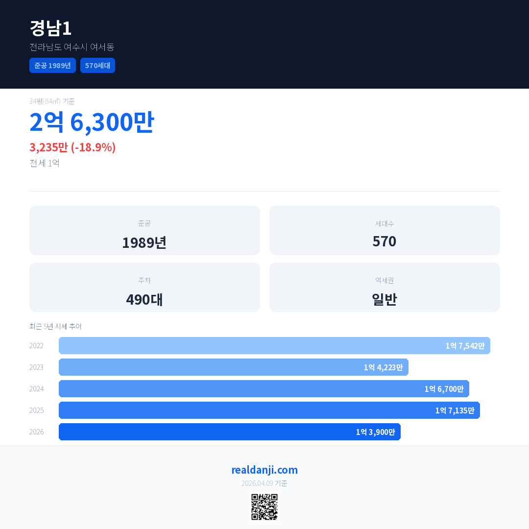 경남1 국민평형 기준 2026년 평균 거래가는 1억 3,900만으로, 전년 대비 18.9% 하락 했습니다.