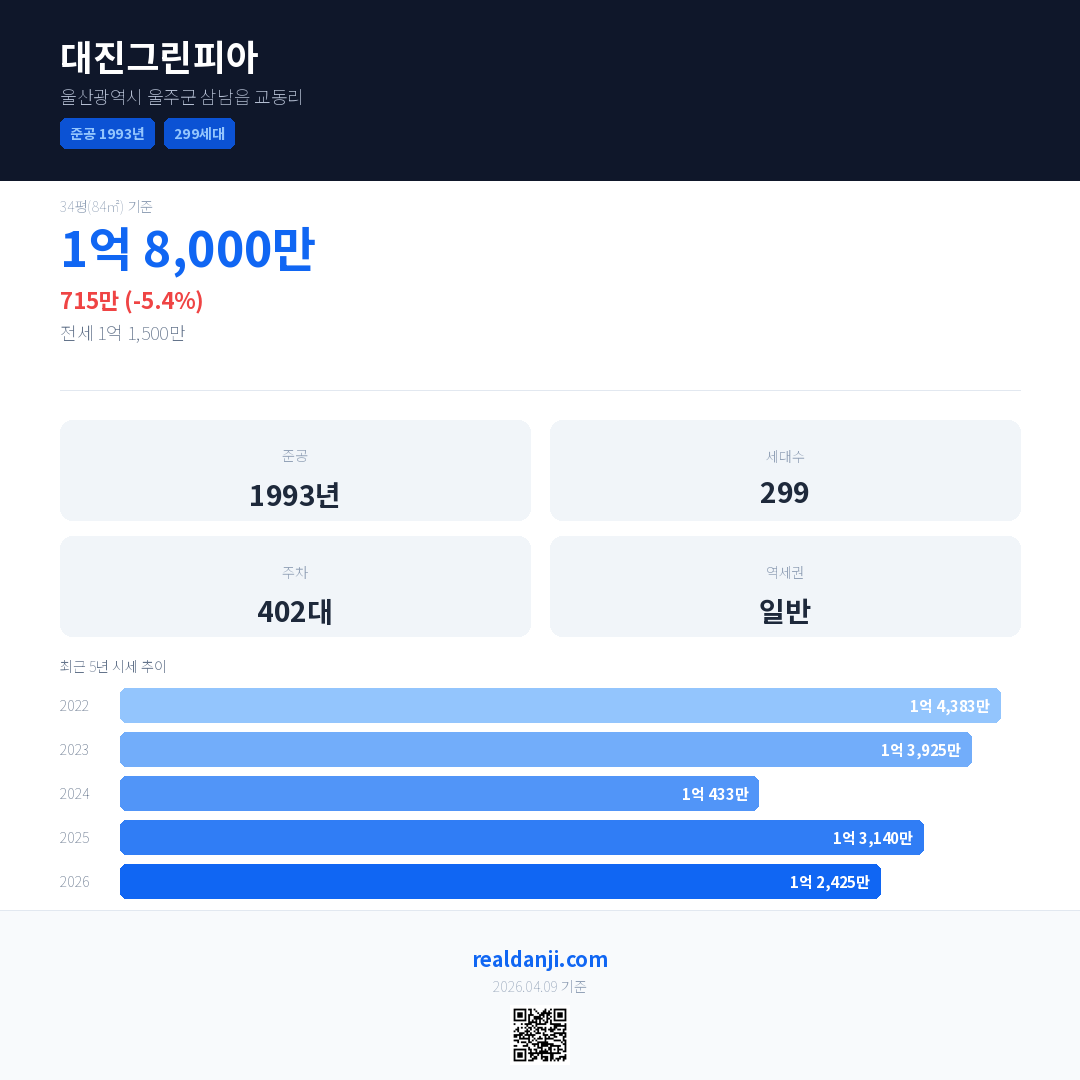 대진그린피아 최근 거래가는 1억 8,000만입니다. (2026-03)
