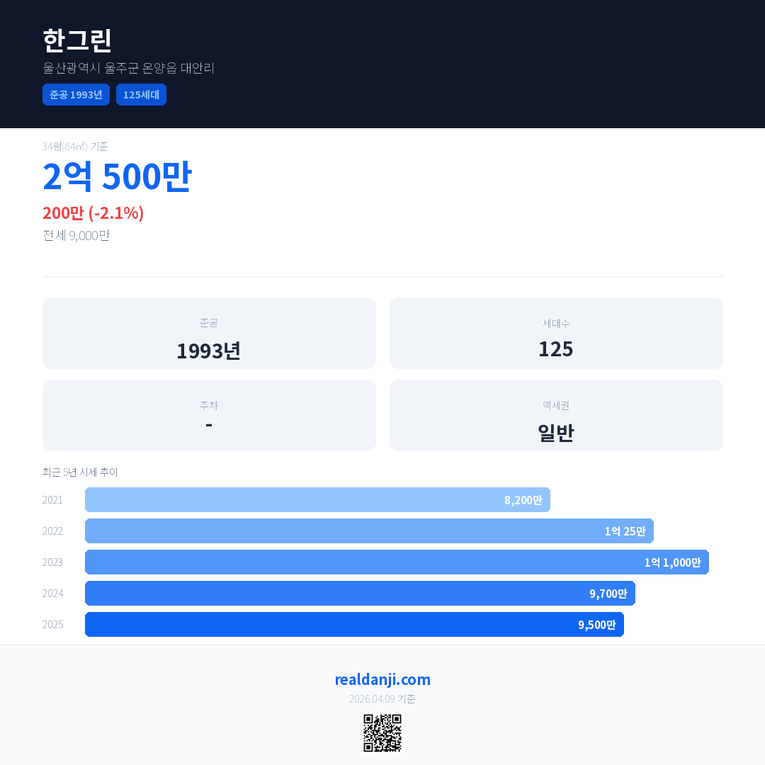 한그린 국민평형 기준 2025년 평균 거래가는 9,500만으로, 전년 대비 2.1% 하락 했습니다.