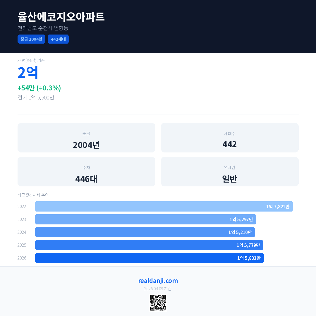 율산에코지오아파트 국민평형 기준 2026년 평균 거래가는 1억 5,833만으로, 전년 대비 0.3% 상승 했습니다.