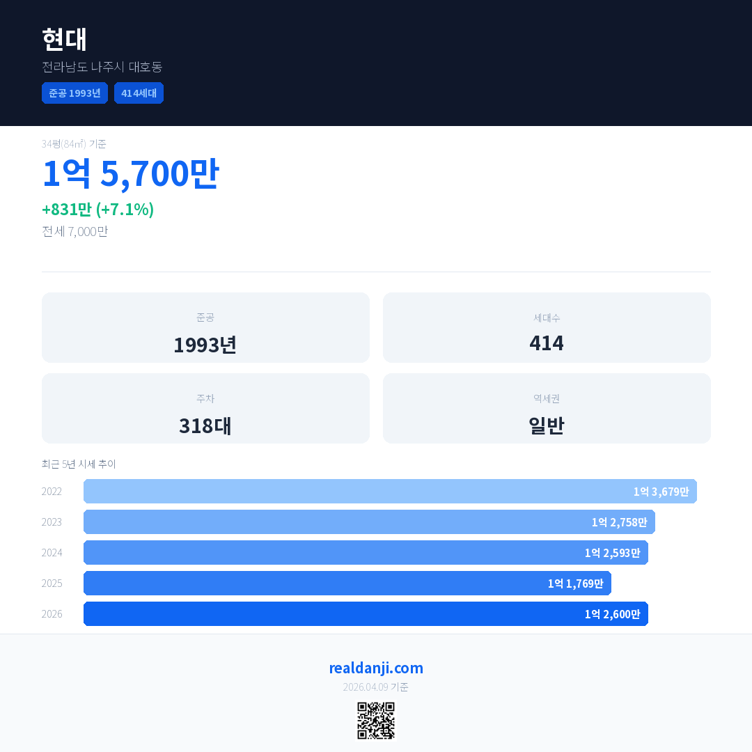 현대은(는) 1993년에 준공되었으며, 현재 33년차입니다. 총 414세대 규모입니다.