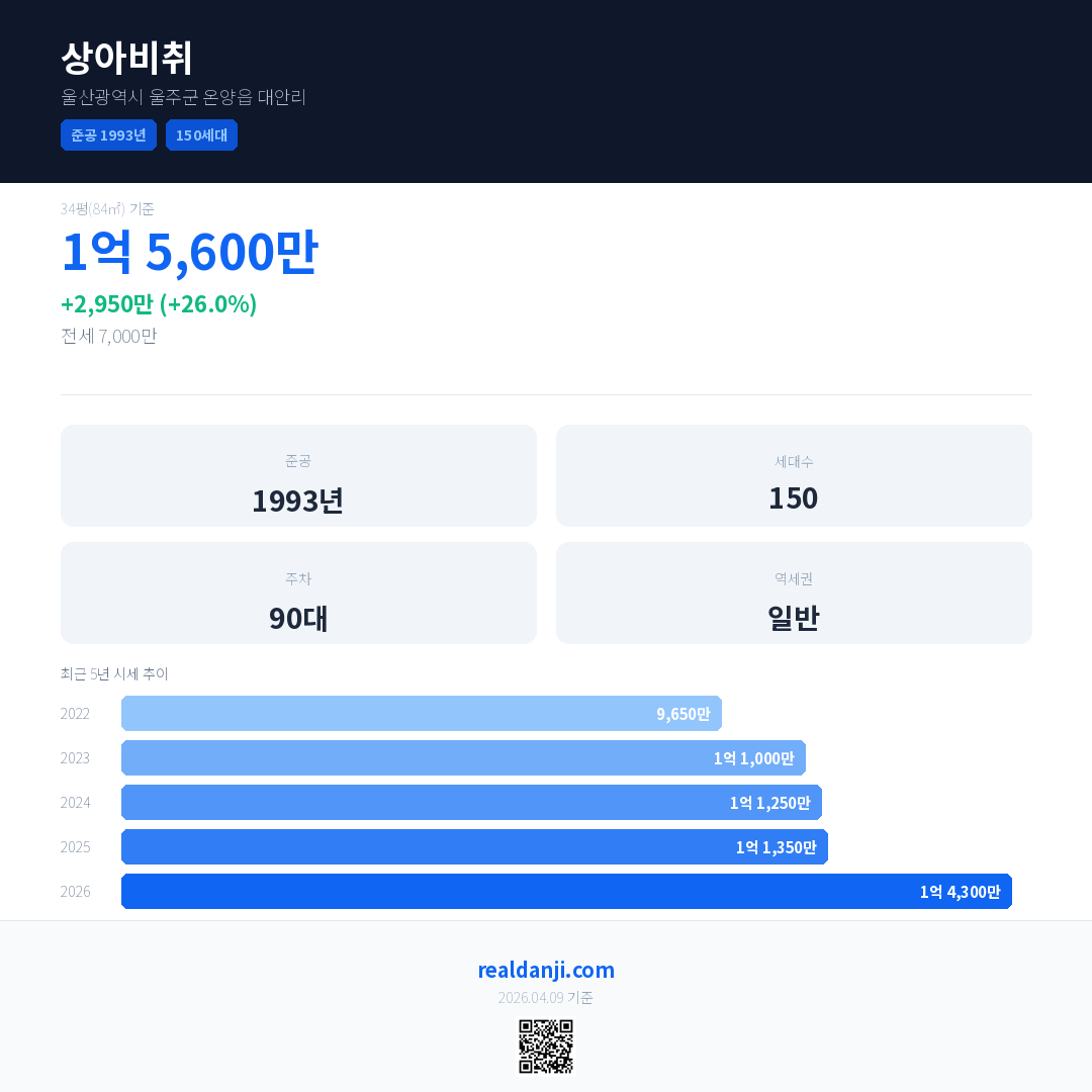 상아비취 국민평형 기준 2026년 평균 거래가는 1억 4,300만으로, 전년 대비 26.0% 상승 했습니다.
