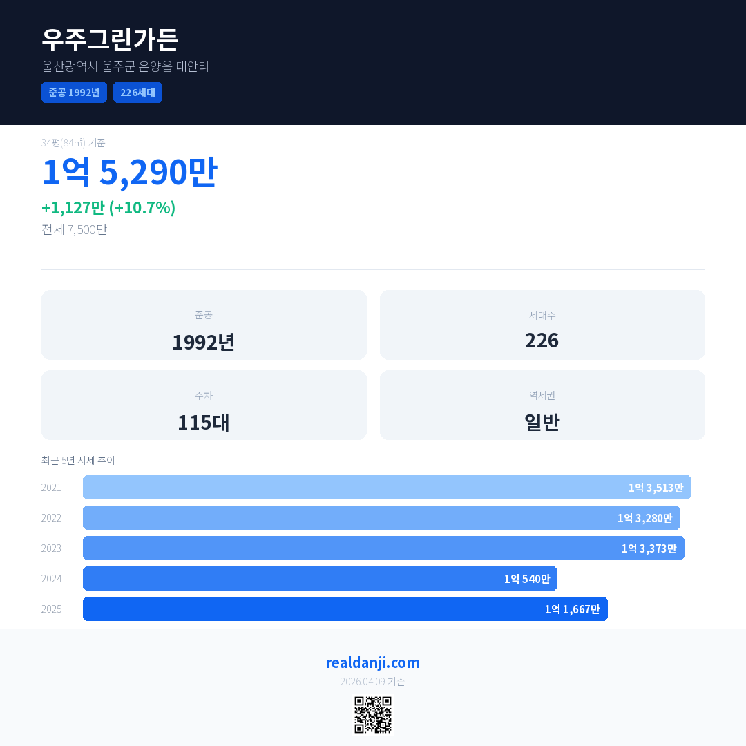 우주그린가든 최근 거래가는 1억 5,290만입니다. (2026-01)