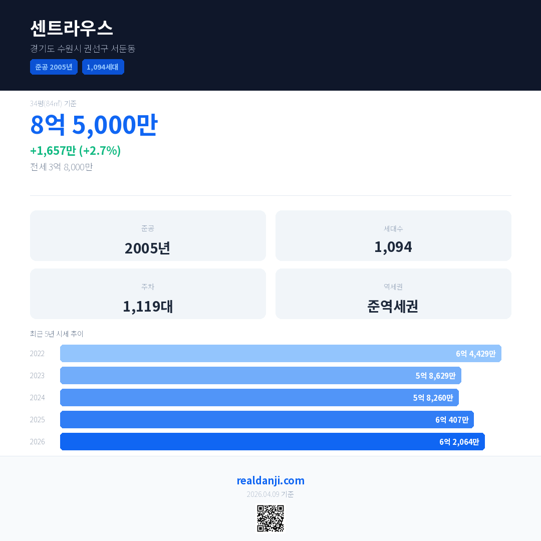 센트라우스 국민평형 기준 2026년 평균 거래가는 6억 2,064만으로, 전년 대비 2.7% 상승 했습니다.