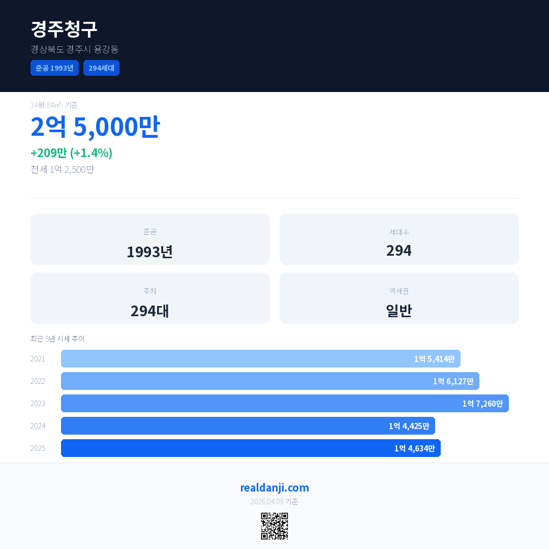 경주청구 국민평형 기준 2025년 평균 거래가는 1억 4,634만으로, 전년 대비 1.4% 상승 했습니다.