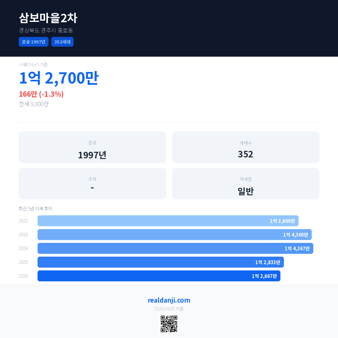 삼보마을2차 국민평형 기준 2026년 평균 거래가는 1억 2,667만으로, 전년 대비 1.3% 하락 했습니다.