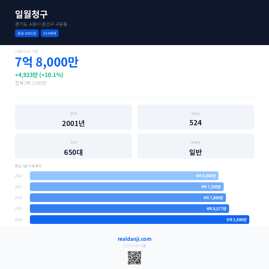 일월청구 국민평형 기준 2026년 평균 거래가는 5억 3,500만으로, 전년 대비 10.1% 상승 했습니다.