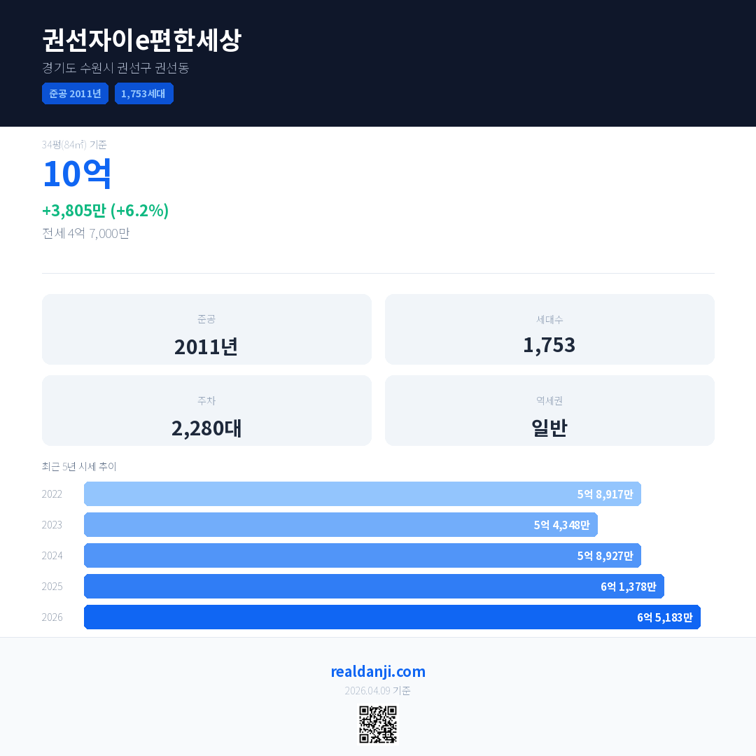 권선자이e편한세상은(는) 2011년에 준공되었으며, 현재 15년차입니다. 총 1,753세대 규모입니다.