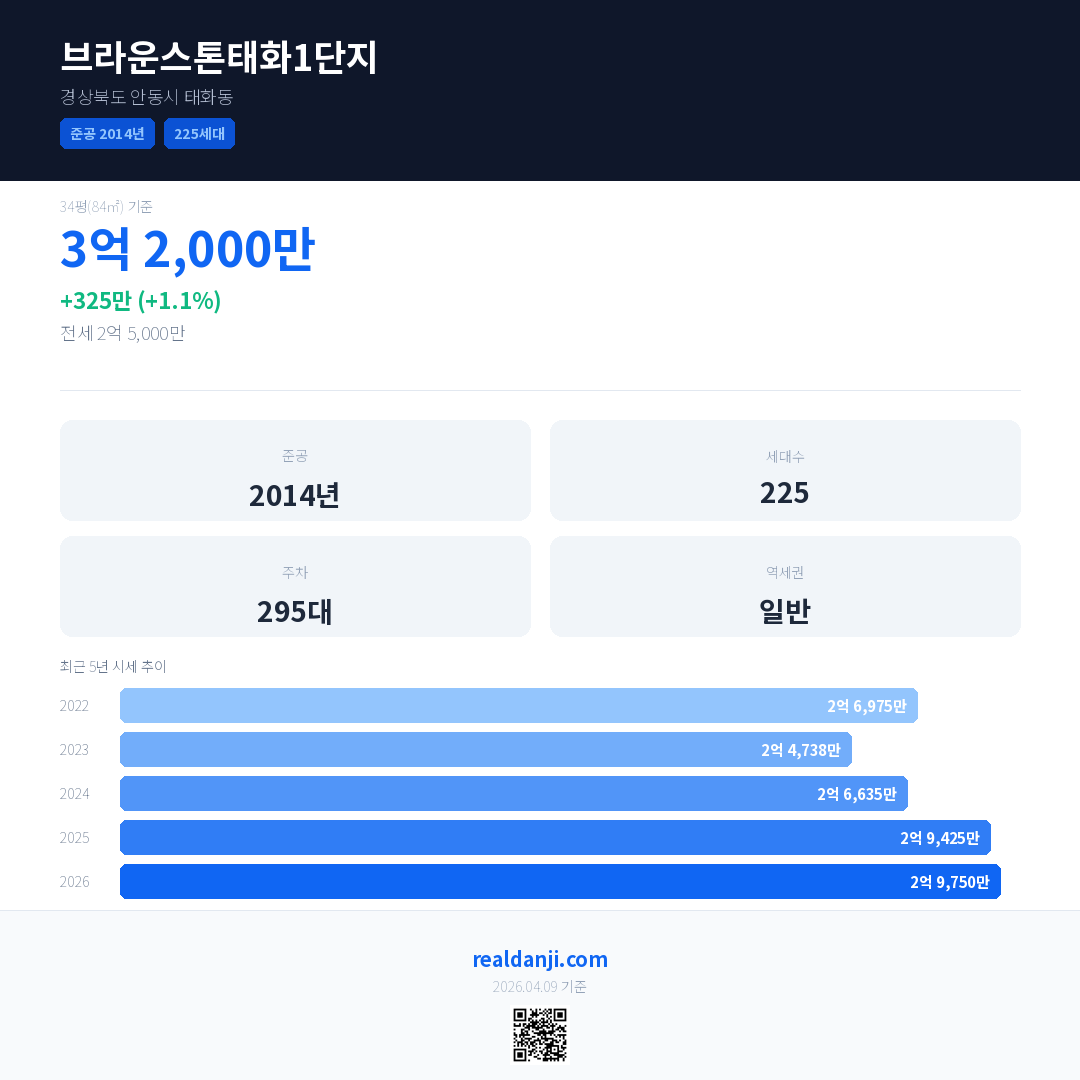 브라운스톤태화1단지 국민평형 기준 2026년 평균 거래가는 2억 9,750만으로, 전년 대비 1.1% 상승 했습니다.