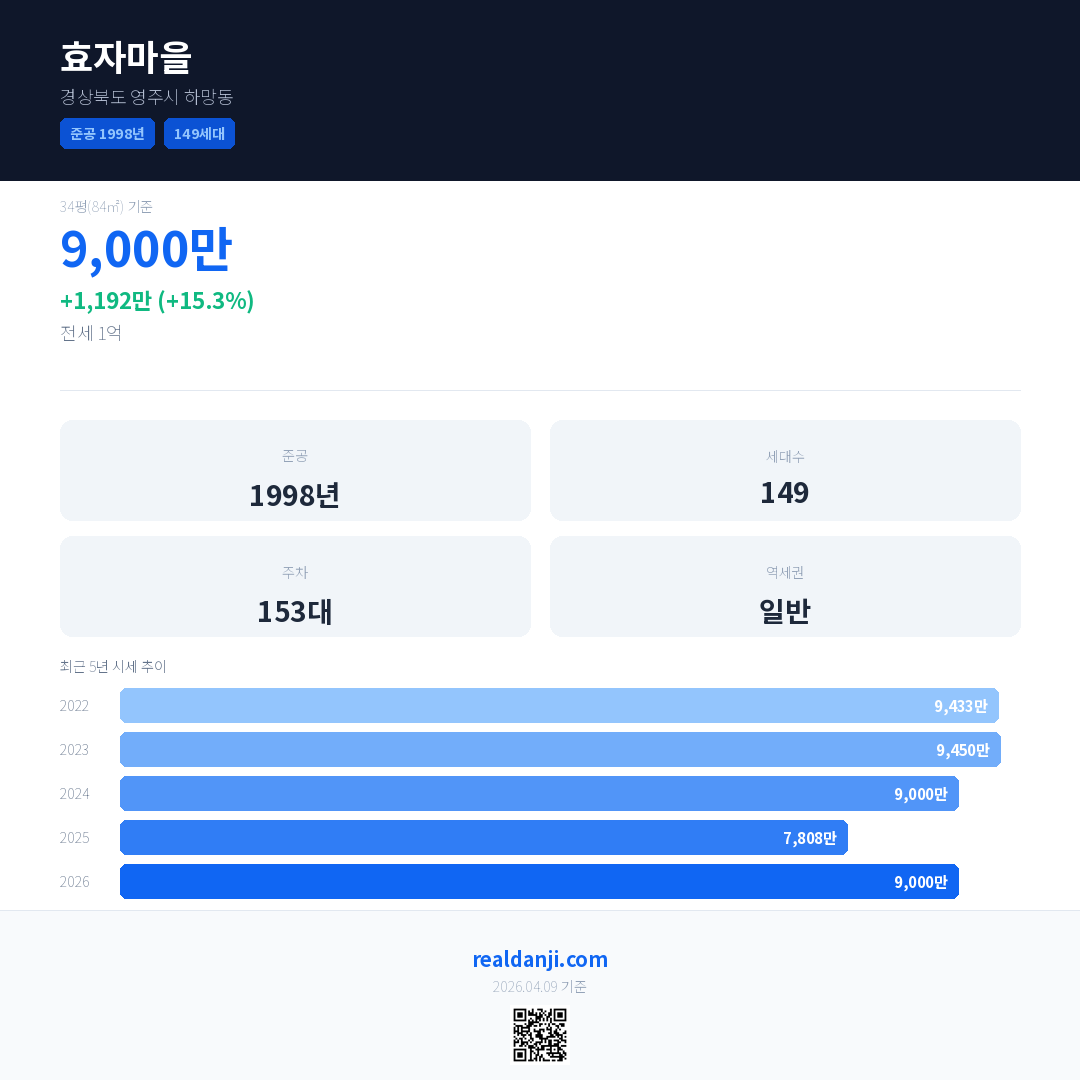효자마을 국민평형 기준 2026년 평균 거래가는 9,000만으로, 전년 대비 15.3% 상승 했습니다.