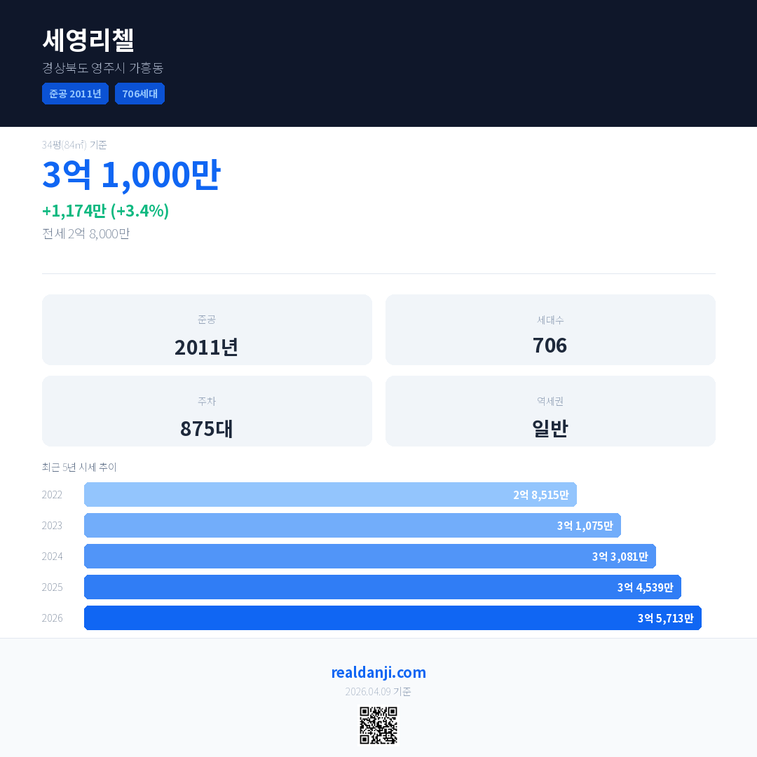 세영리첼 국민평형 기준 2026년 평균 거래가는 3억 5,713만으로, 전년 대비 3.4% 상승 했습니다.