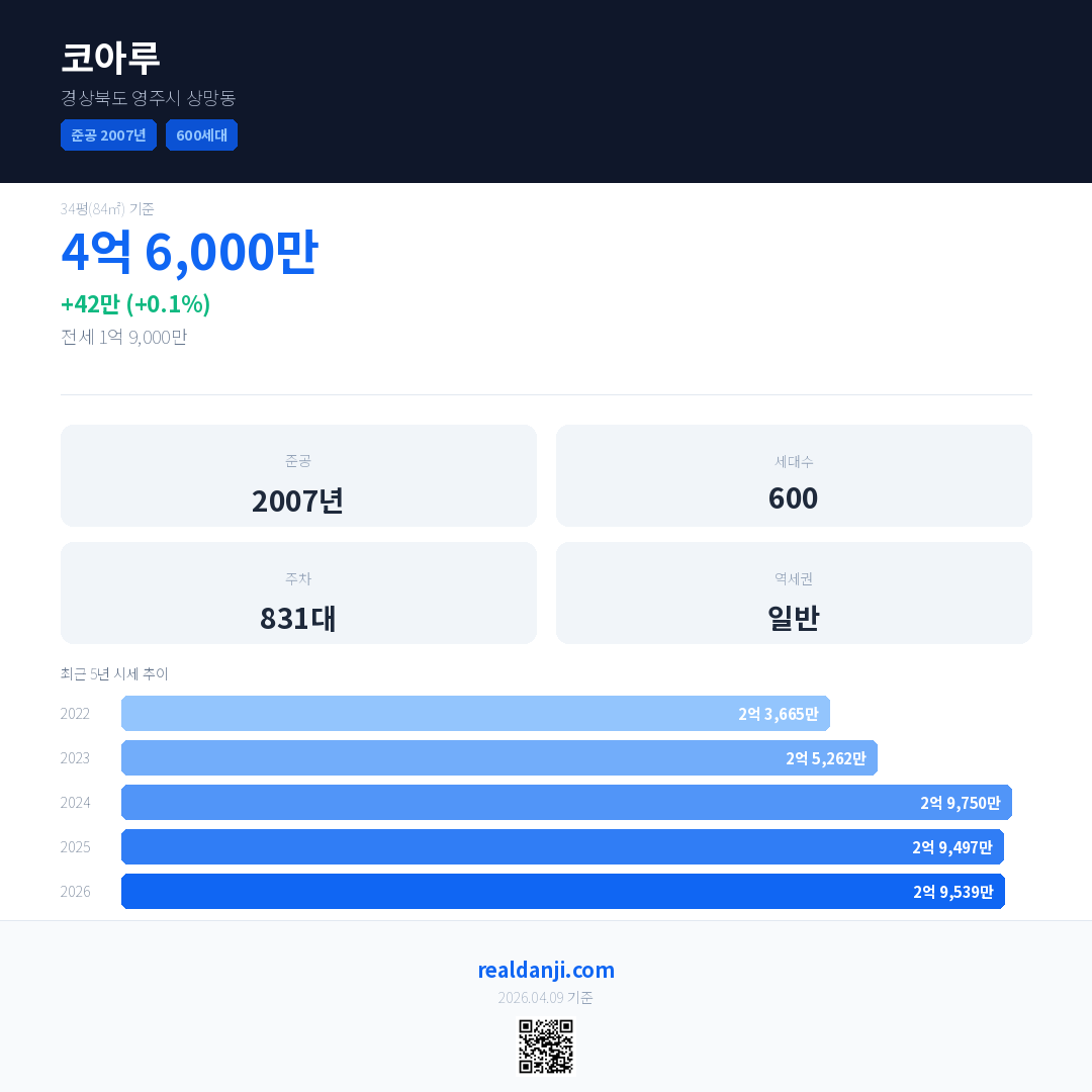 코아루 국민평형 기준 2026년 평균 거래가는 2억 9,539만으로, 전년 대비 0.1% 상승 했습니다.