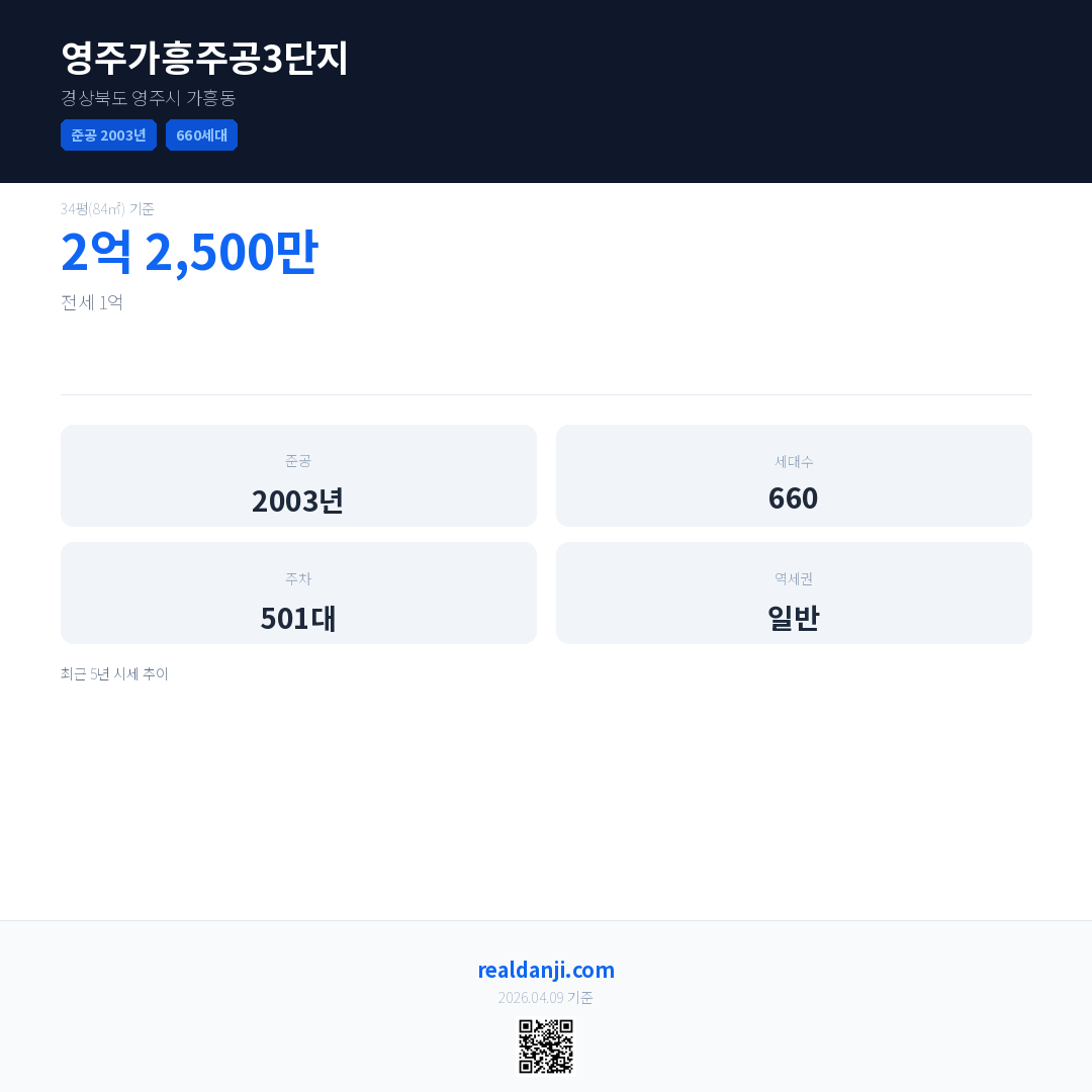 영주가흥주공3단지 최근 거래가는 2억 2,500만입니다. (2026-03)