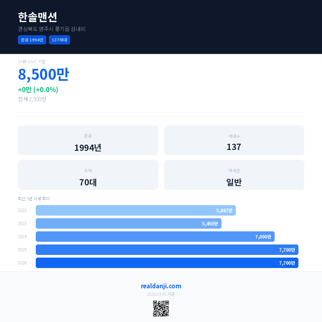한솔맨션 국민평형 기준 2026년 평균 거래가는 7,700만으로, 전년 대비 0.0% 하락 했습니다.