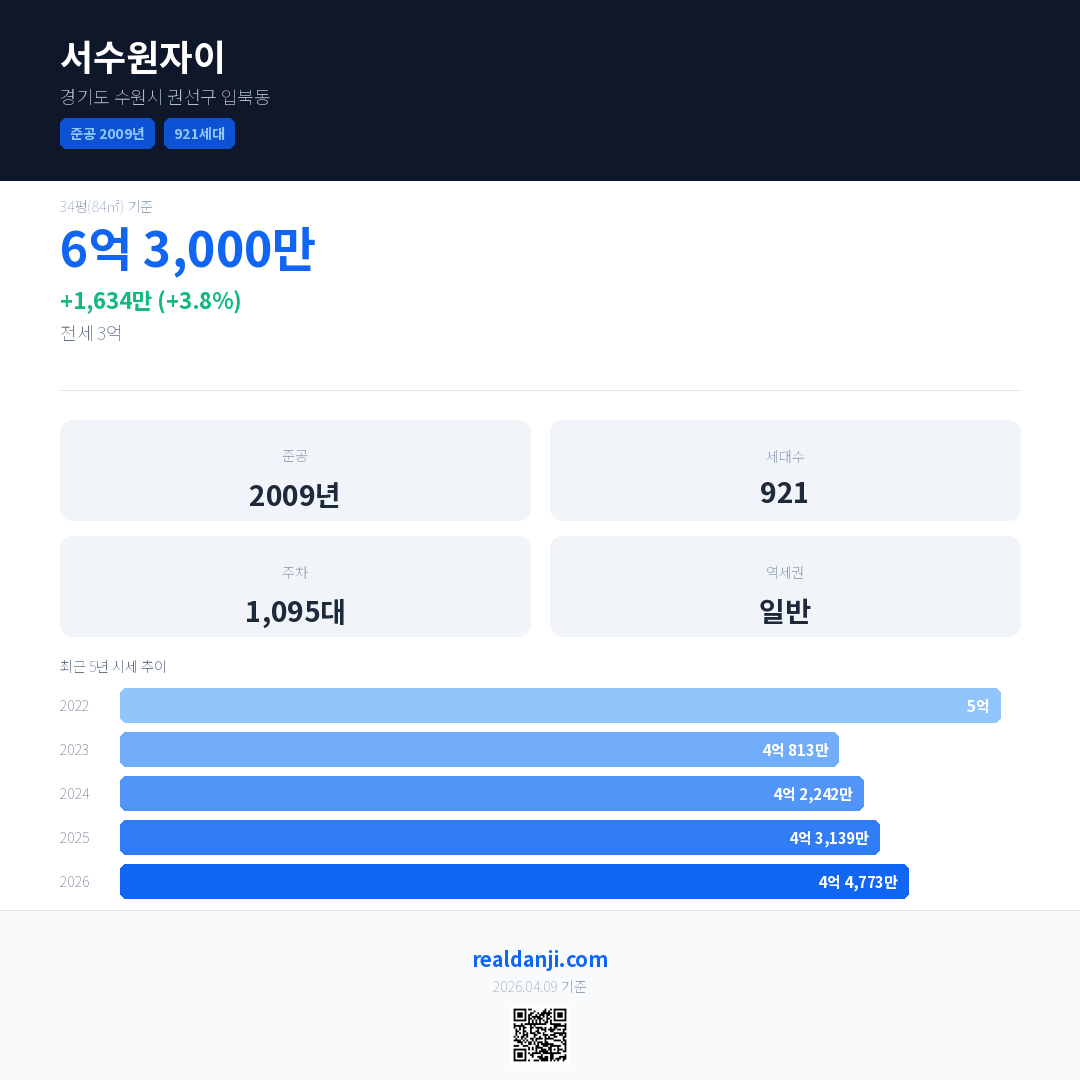 서수원자이 국민평형 기준 2026년 평균 거래가는 4억 4,773만으로, 전년 대비 3.8% 상승 했습니다.