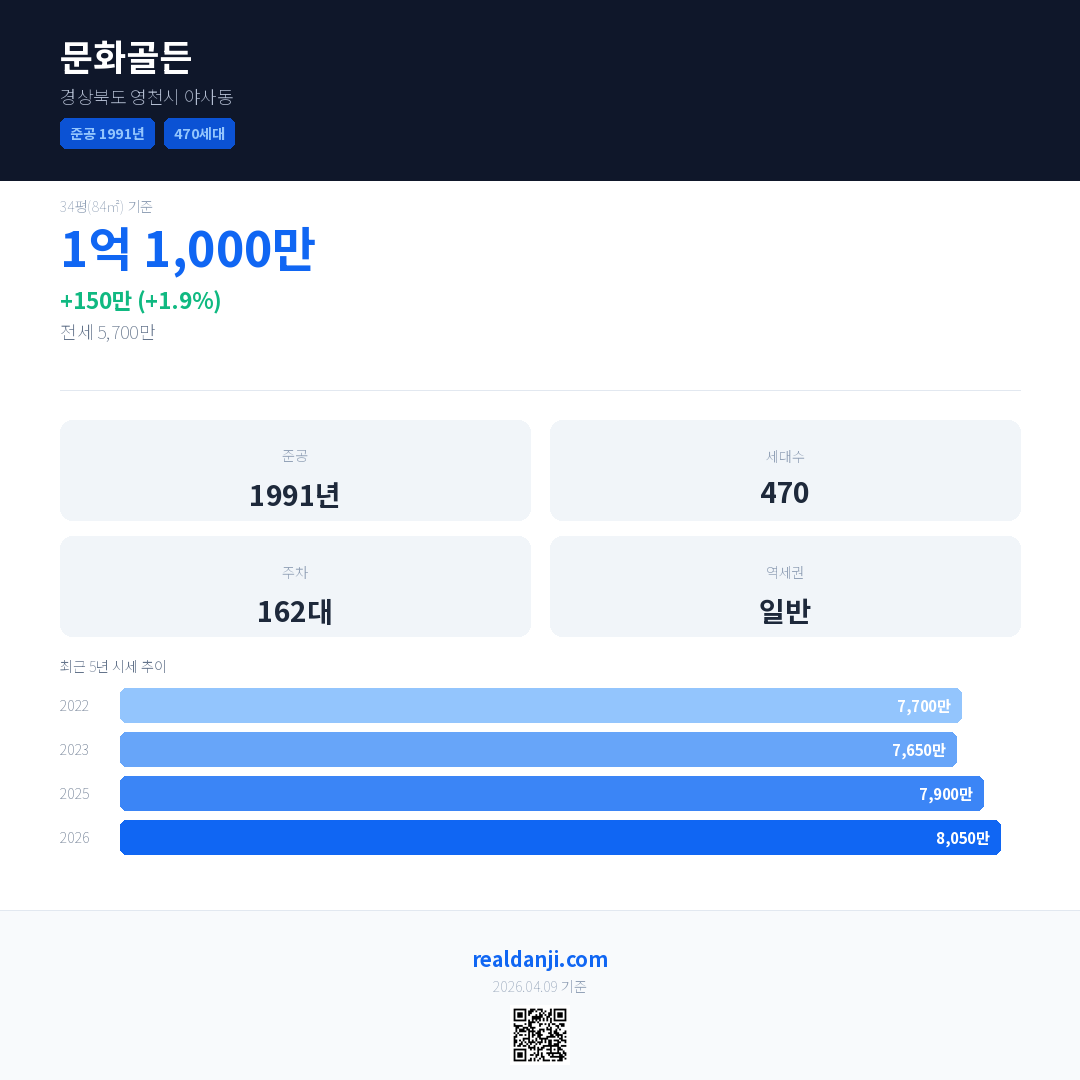 문화골든 국민평형 기준 2026년 평균 거래가는 8,050만으로, 전년 대비 1.9% 상승 했습니다.