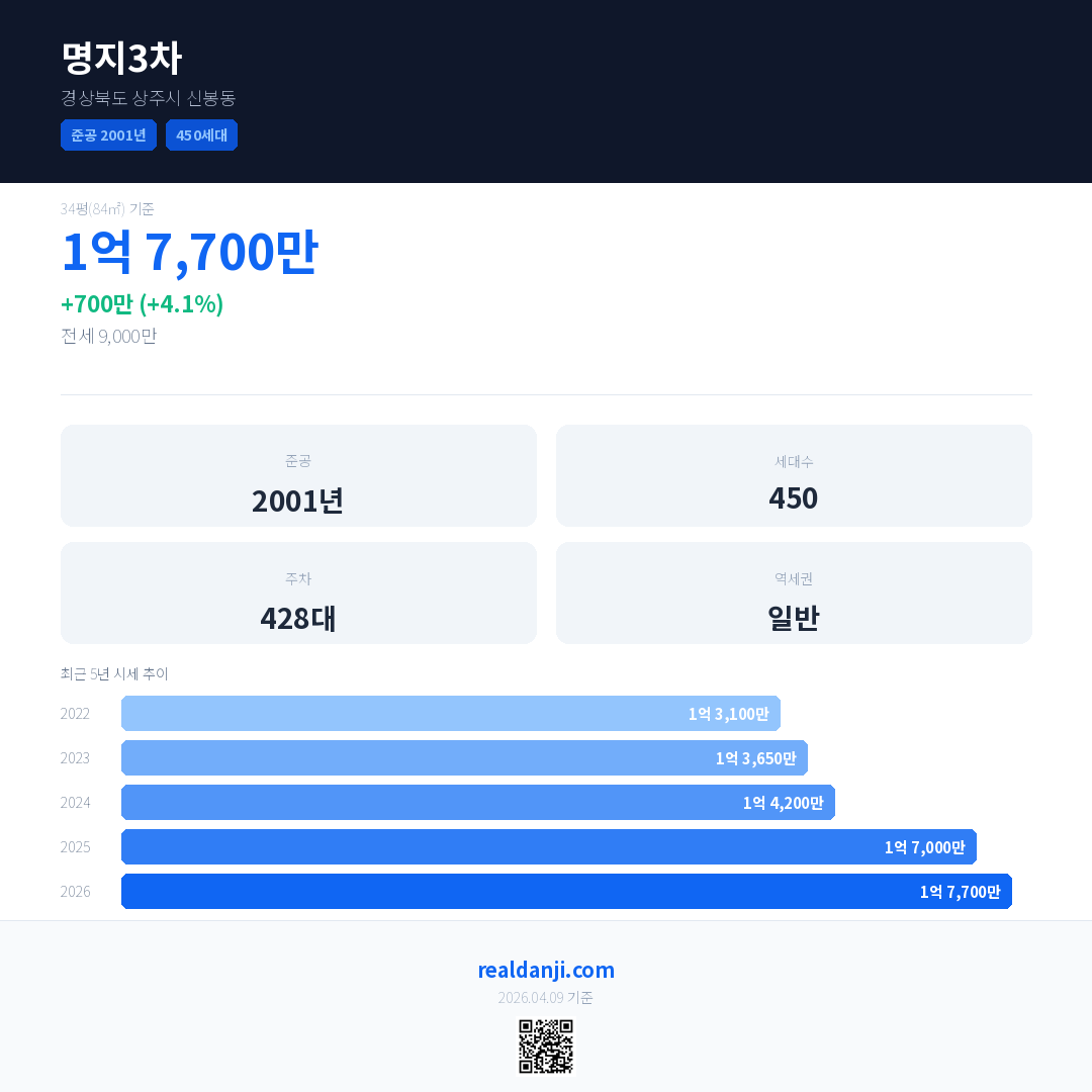 명지3차 국민평형 기준 2026년 평균 거래가는 1억 7,700만으로, 전년 대비 4.1% 상승 했습니다.