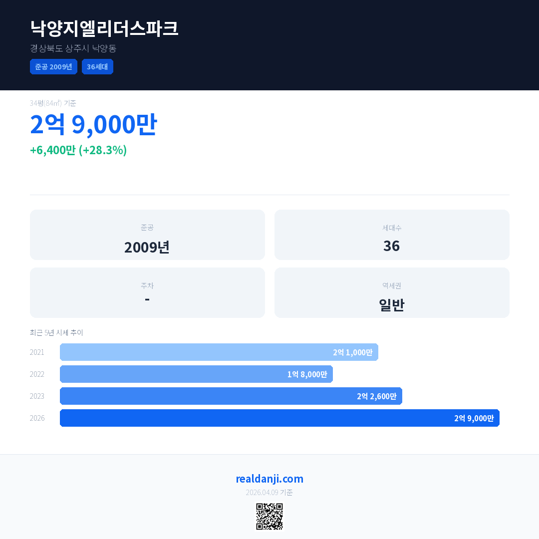 낙양지엘리더스파크 국민평형 기준 2026년 평균 거래가는 2억 9,000만으로, 전년 대비 28.3% 상승 했습니다.