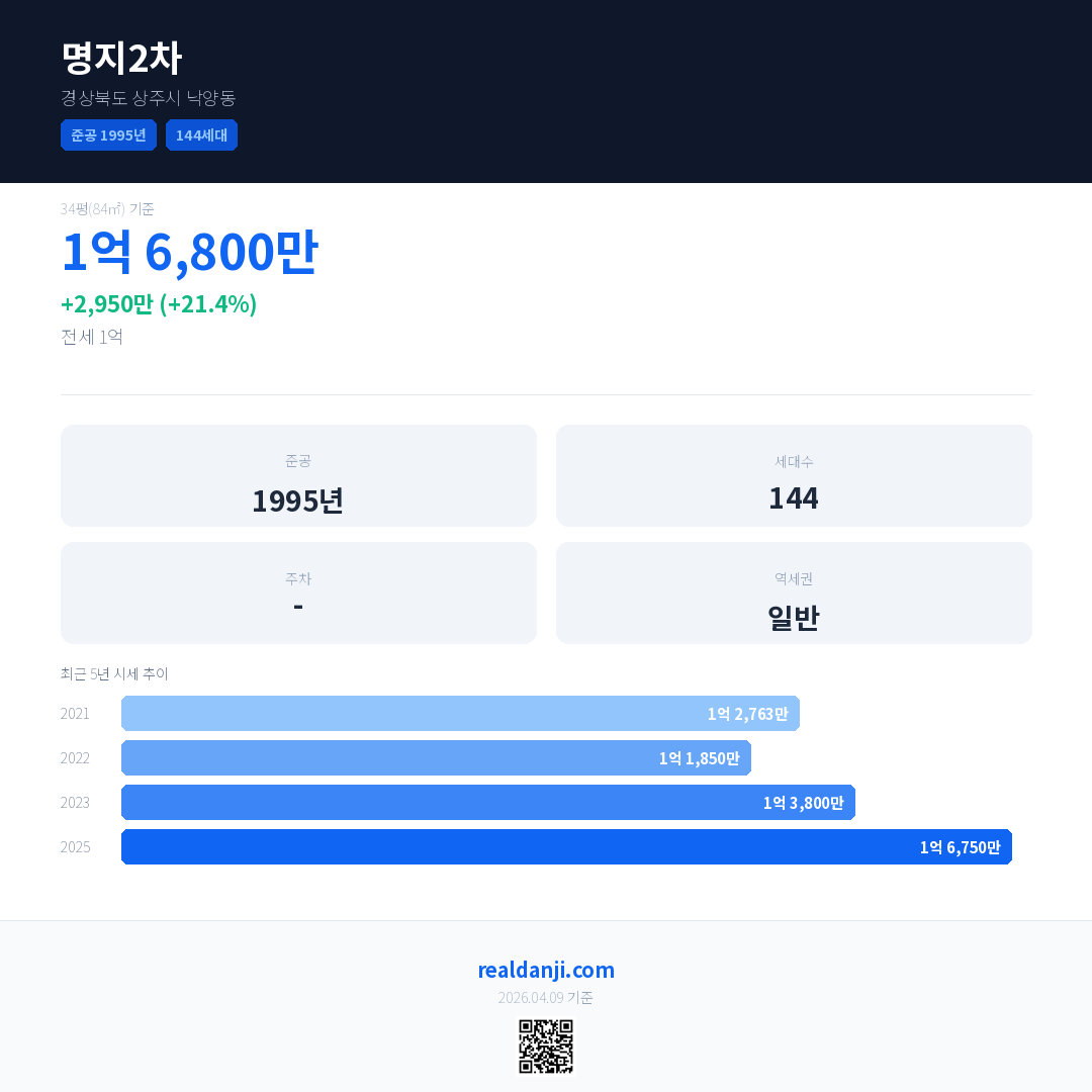 명지2차 국민평형 기준 2025년 평균 거래가는 1억 6,750만으로, 전년 대비 21.4% 상승 했습니다.