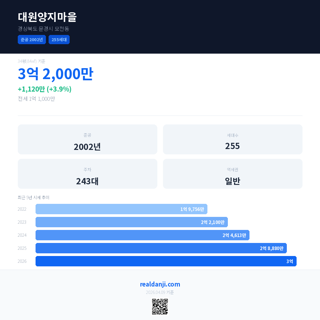 대원양지마을 국민평형 기준 2026년 평균 거래가는 3억으로, 전년 대비 3.9% 상승 했습니다.
