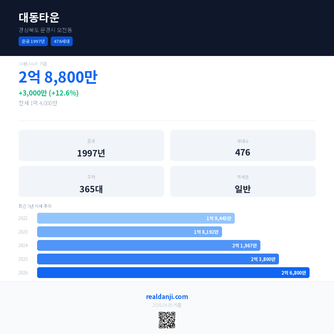 대동타운 국민평형 기준 2026년 평균 거래가는 2억 6,800만으로, 전년 대비 12.6% 상승 했습니다.