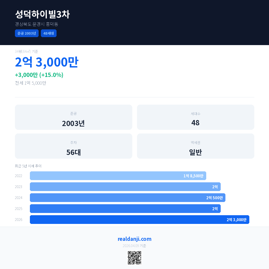 성덕하이빌3차 국민평형 기준 2026년 평균 거래가는 2억 3,000만으로, 전년 대비 15.0% 상승 했습니다.