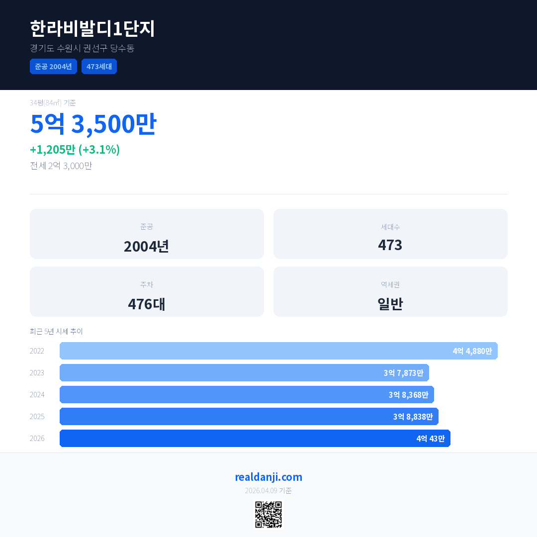 한라비발디1단지 국민평형 기준 2026년 평균 거래가는 4억 43만으로, 전년 대비 3.1% 상승 했습니다.