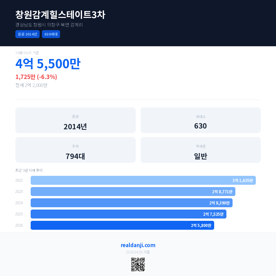 창원감계힐스테이트3차 최근 거래가는 2억 5,200만입니다. (2026-04)