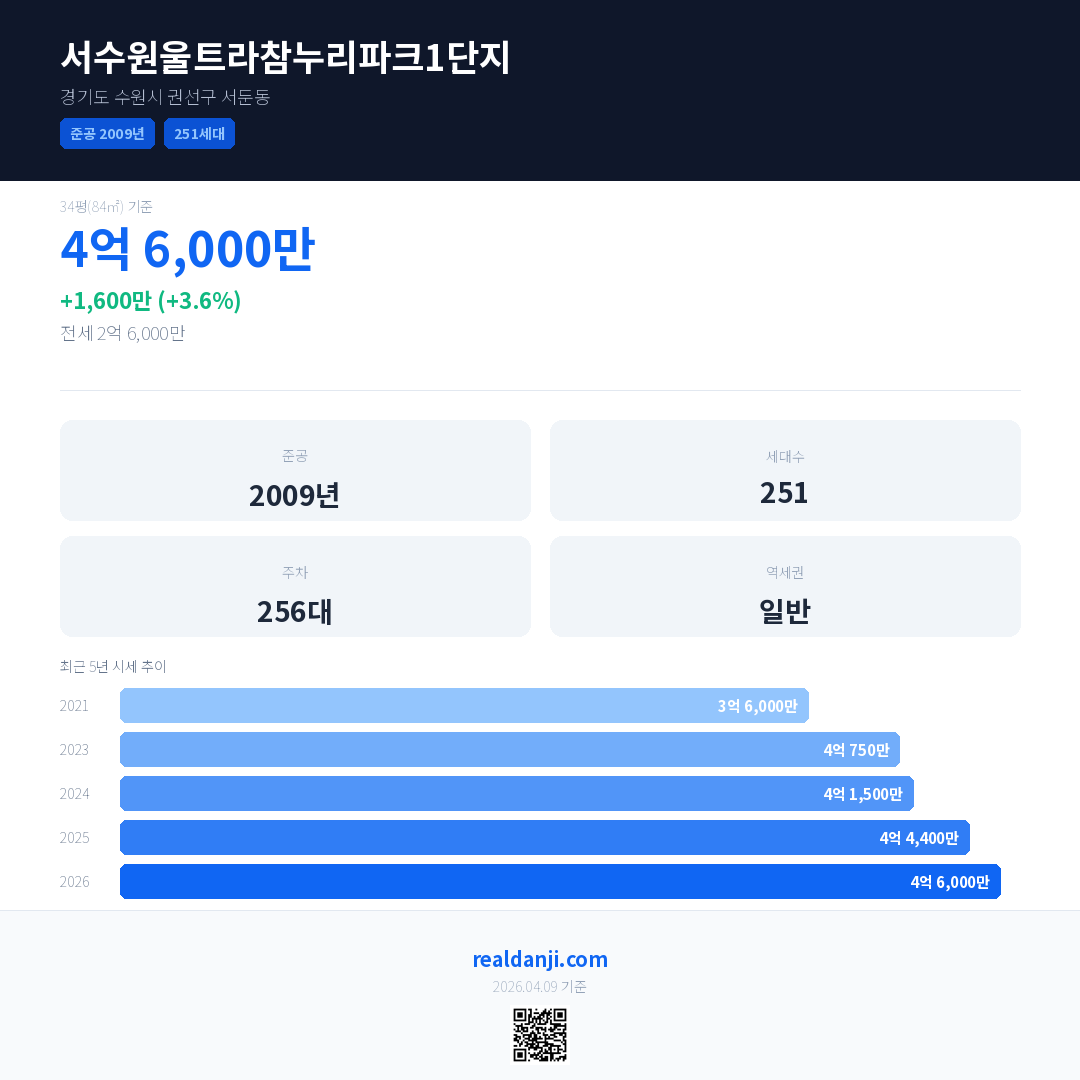 서수원울트라참누리파크1단지 최근 거래가는 4억 6,000만입니다. (2026-02)