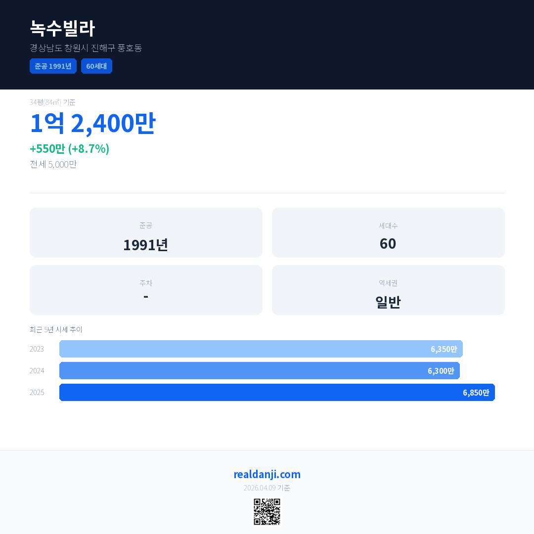 녹수빌라 국민평형 기준 2025년 평균 거래가는 6,850만으로, 전년 대비 8.7% 상승 했습니다.
