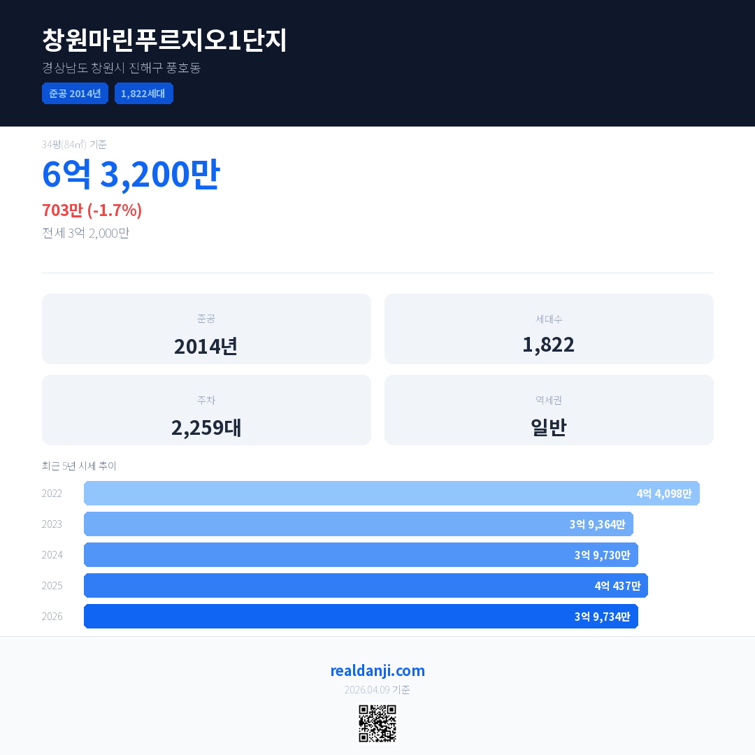 창원마린푸르지오1단지 최근 거래가는 6억 3,200만입니다. (2026-04)