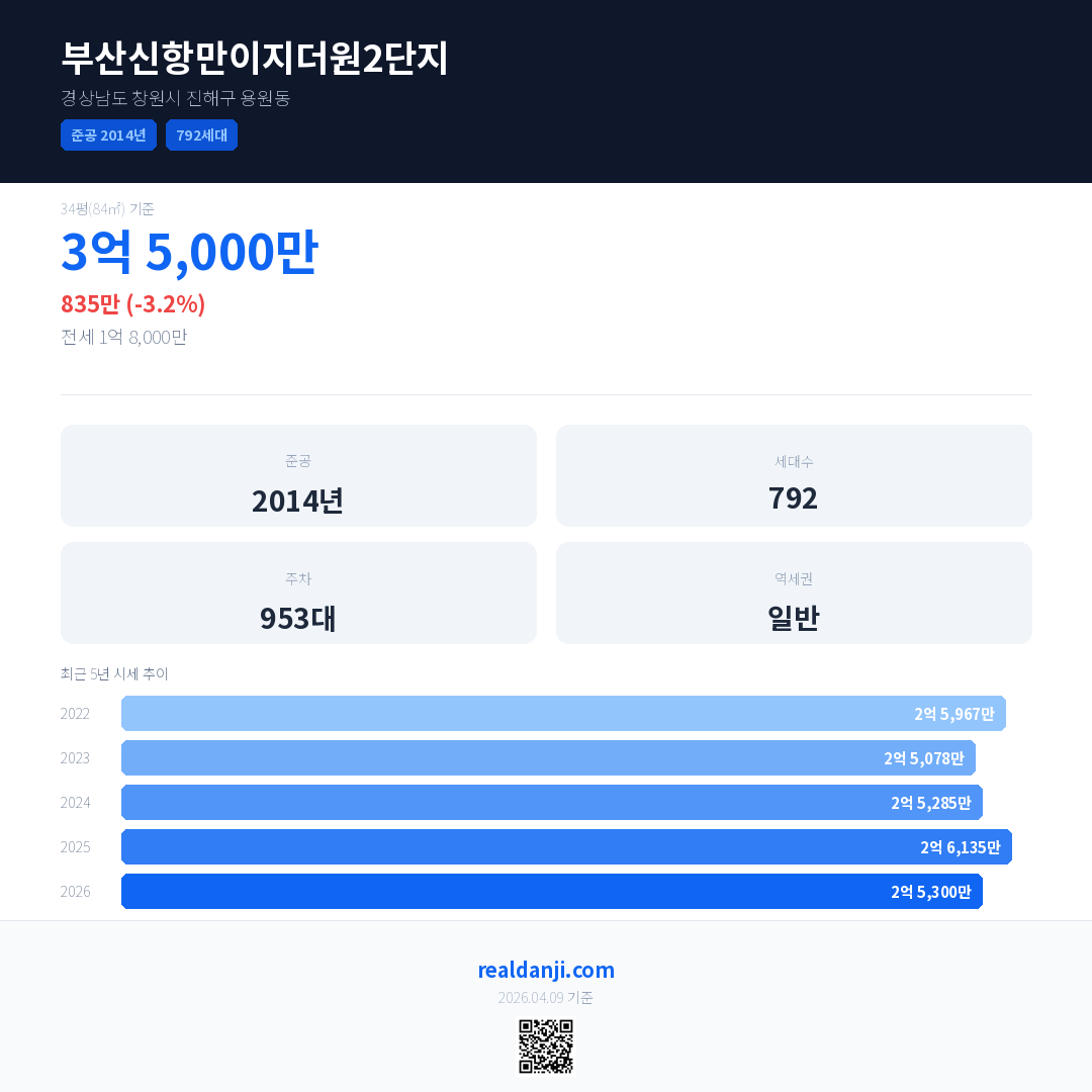 부산신항만이지더원2단지 최근 거래가는 3억 5,000만입니다. (2026-03)