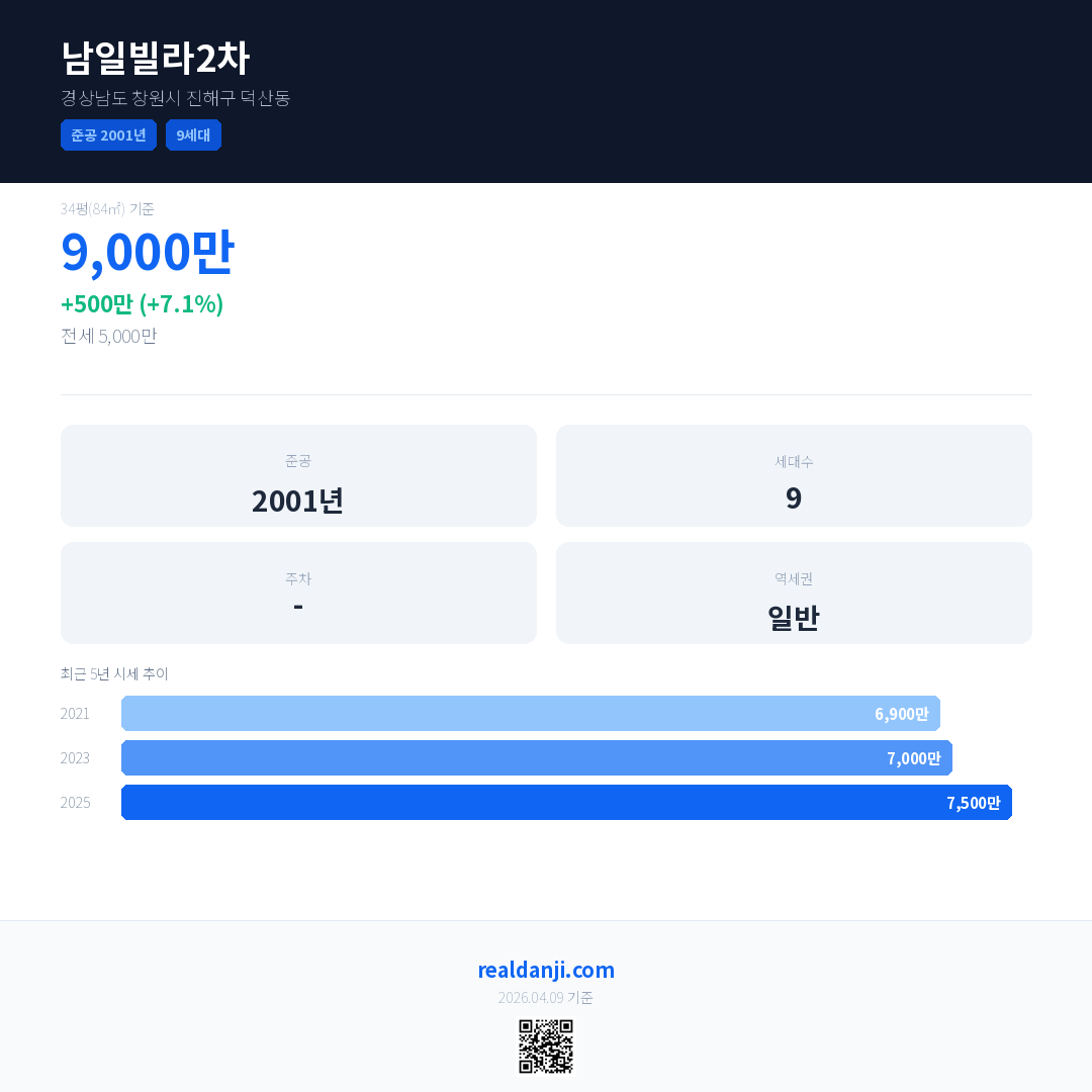 남일빌라2차 최근 거래가는 9,000만입니다. (2025-05)