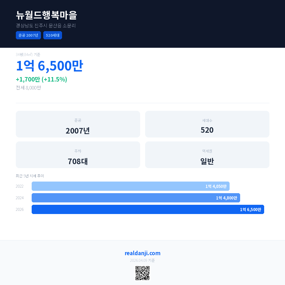뉴월드행복마을 국민평형 기준 2026년 평균 거래가는 1억 6,500만으로, 전년 대비 11.5% 상승 했습니다.