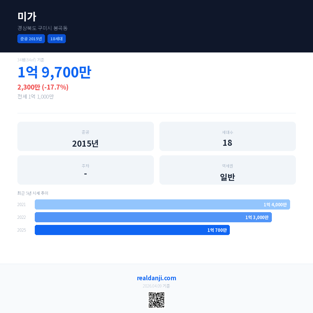 미가 국민평형 기준 2025년 평균 거래가는 1억 700만으로, 전년 대비 17.7% 하락 했습니다.