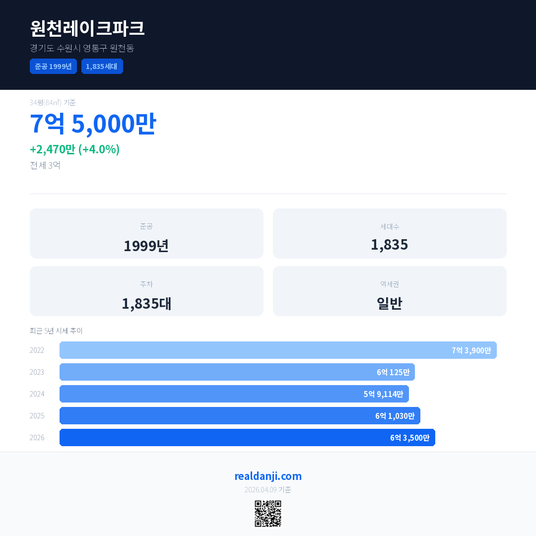 원천레이크파크 최근 거래가는 7억 5,000만입니다. (2026-03)