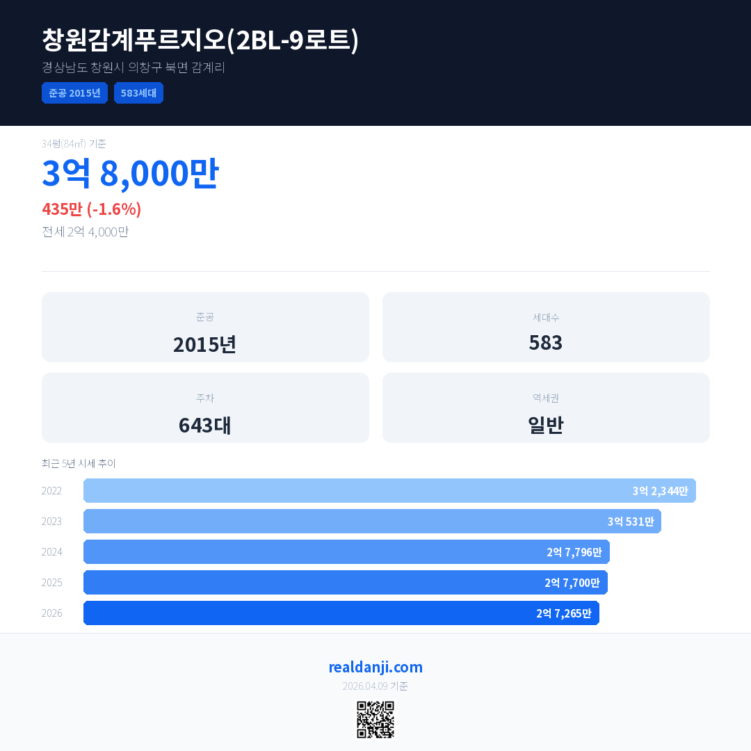 창원감계푸르지오(2BL-9로트) 최근 거래가는 3억 8,000만입니다. (2026-03)