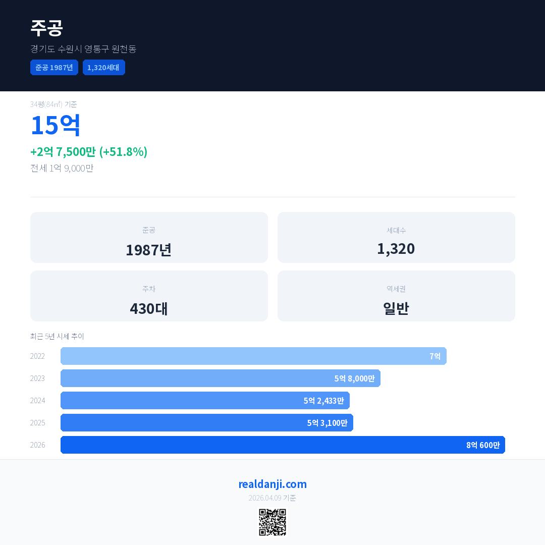 주공은(는) 1987년에 준공되었으며, 현재 39년차입니다. 총 1,320세대 규모입니다.