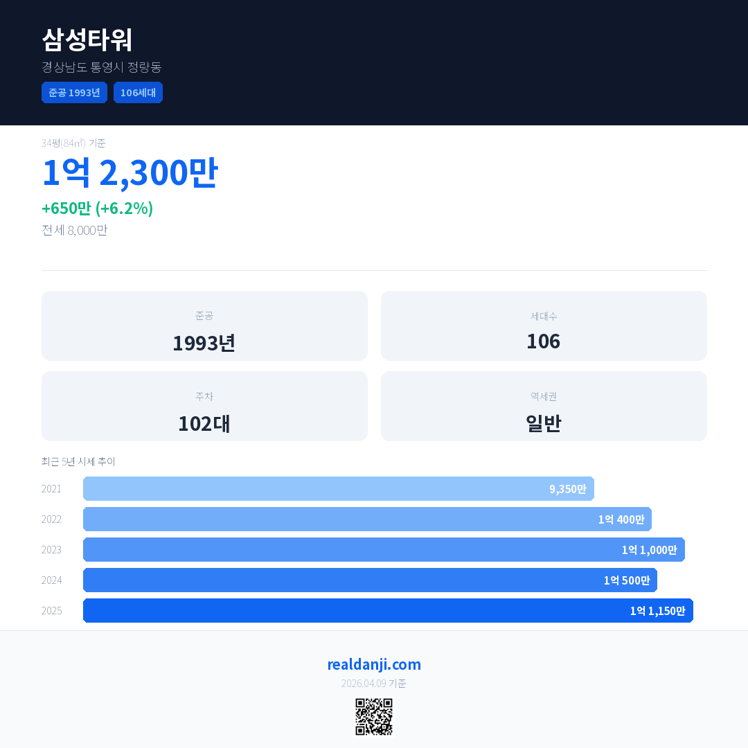 삼성타워 국민평형 기준 2025년 평균 거래가는 1억 1,150만으로, 전년 대비 6.2% 상승 했습니다.