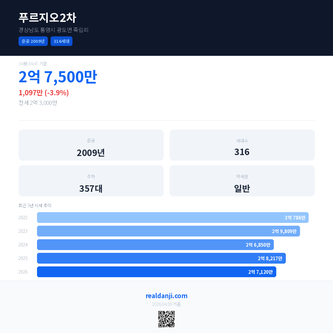 푸르지오2차은(는) 2009년에 준공되었으며, 현재 17년차입니다. 총 316세대 규모입니다.