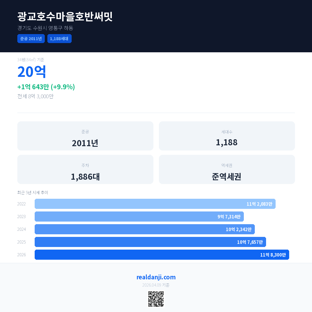 광교호수마을호반써밋 국민평형 기준 2026년 평균 거래가는 11억 8,300만으로, 전년 대비 9.9% 상승 했습니다.